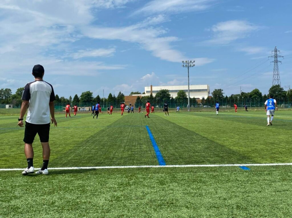 前期リーグ グループB 1位の札幌英藍は2・3年生も出場しており、フィジカル面での不利が予想されましたが、前半20分までにカウンターから39/中村①が2得点してリードします。しかし、球際で負ける場面が多く、30分にカウンターから失点して2-1で前半を終えます。後半10分過ぎから土砂降りとなり、グラウンドが一面水浸しとなりますが、全員がハードワークして失点を許さず、2-1で勝利しました。前期リーグは4勝1敗でグループB 6チーム中1位となり、後期は上位リーグで戦うことになりました。また、8月3日(火)にトレーニングマッチを行いました。結果は次の通りです。